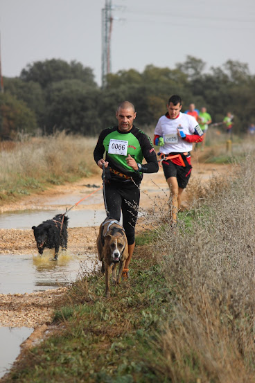 En Nuevo Baztán fue la sede elegida para la 4ª prueba puntuable para la II Liga Centro, organizado por el Club de Canicross ACUNR, benéfico para su protectora. La prueba consistía en un recorrido de 7kms con salida y llegada en la plaza del pueblo. El recorrido tenía muchas subidas y bajadas, que discurría entre encinas con caminos muy anchos, repletos de charcos enormes por las lluvias de los últimos días. Pero destacaba una bajada con bastante pendiente antes del kilómetro 4 y una subida con un desnivel considerable antes del 5º kilómetro. A la prueba acudimos: Jorge - Yuca y Jorge - Mangu, pero la prueba reina tuvo un total de 67 participantes. Esto es los que nos comentaban nuestros compañeros: